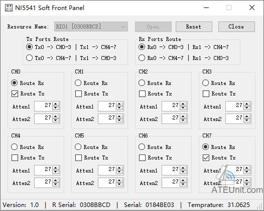 | tn.niSwitch5541 | niSwitch5541SgDefaultAtten | (void) | in DutPort: 对应0-7的端口号 in Atten1: 端口开启时,衰减器1的值(0-127) in Atten2: 端口开启时,衰减器2的值(0-127) 单位0.25dB,默认值27。 | 发送端口设置为开启时的衰减器值 |