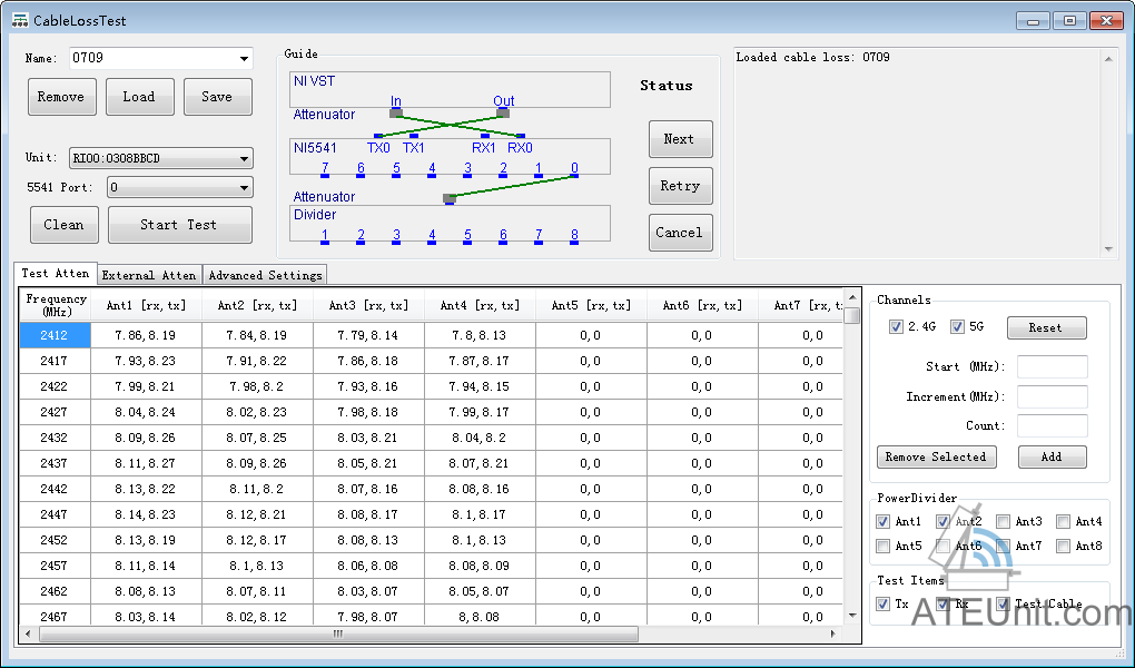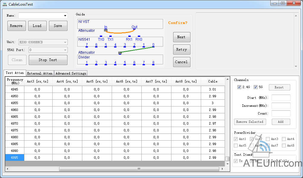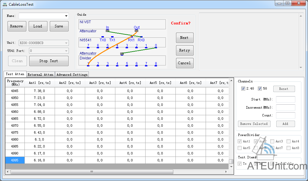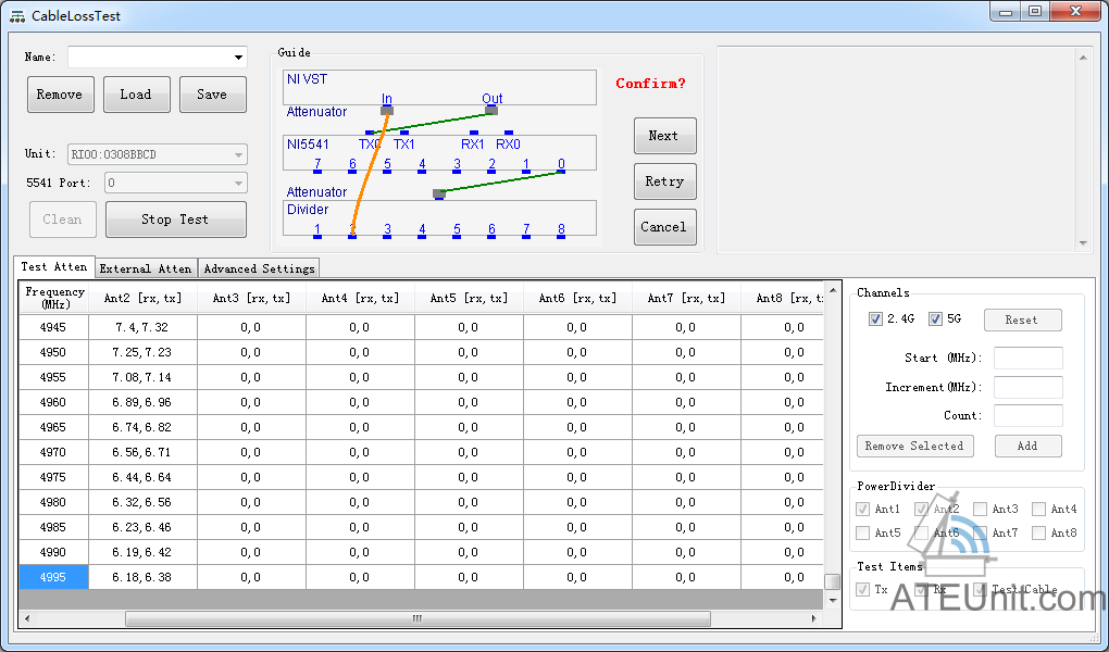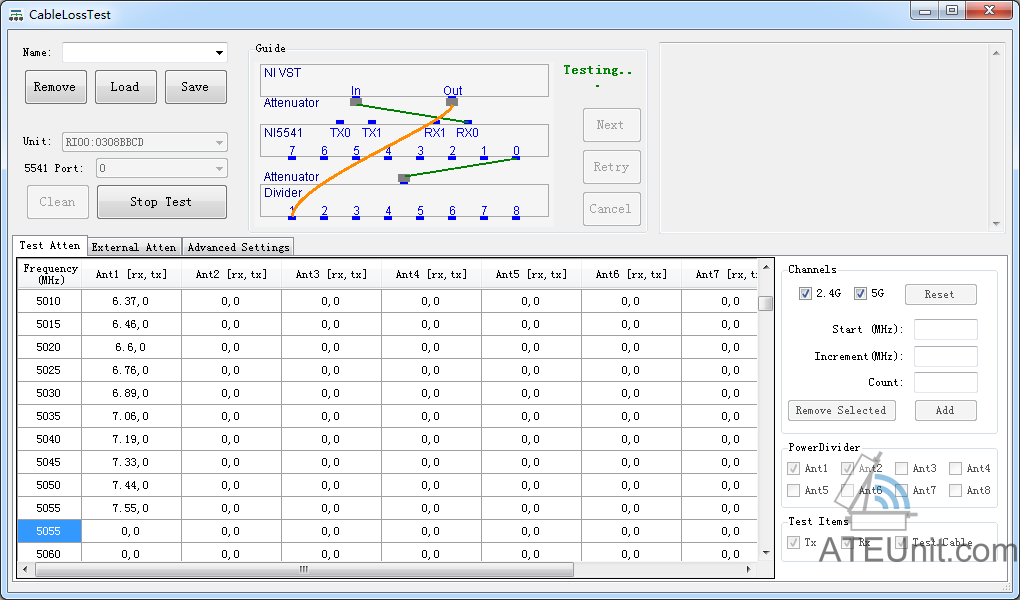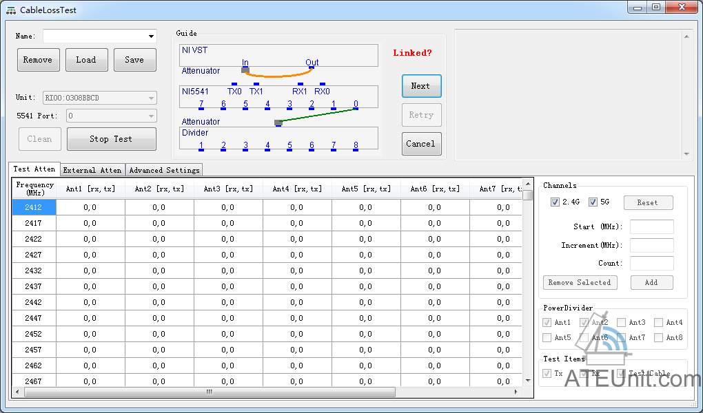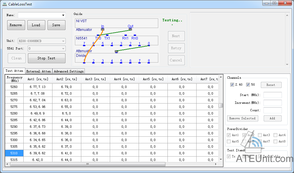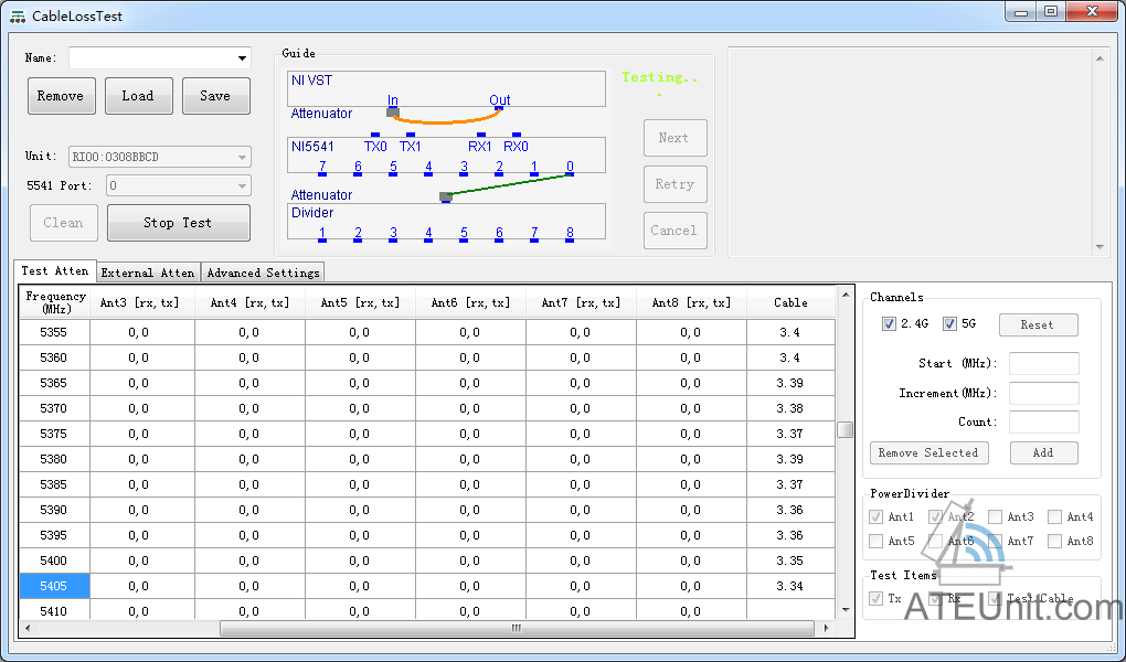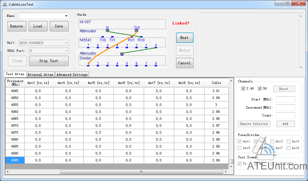 - 先使用ATEUnitRemote中的CableLoss工具来测线损。UDT的IPEX到功分器SMA的衰减,通过CableLoss里的ExternalAtten来设置。