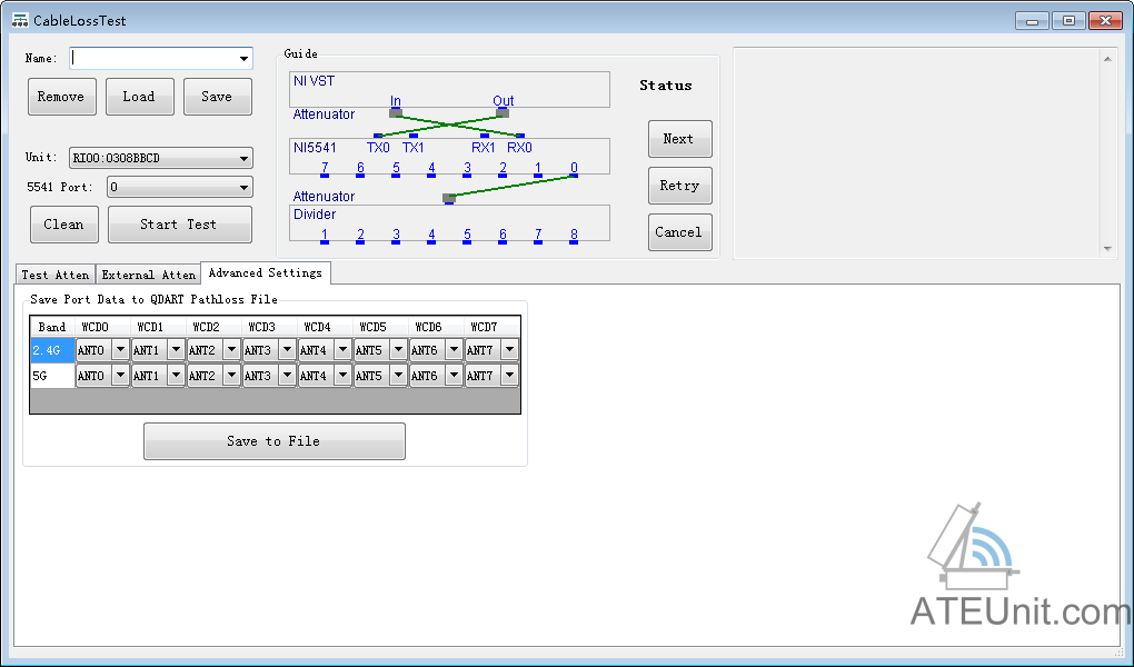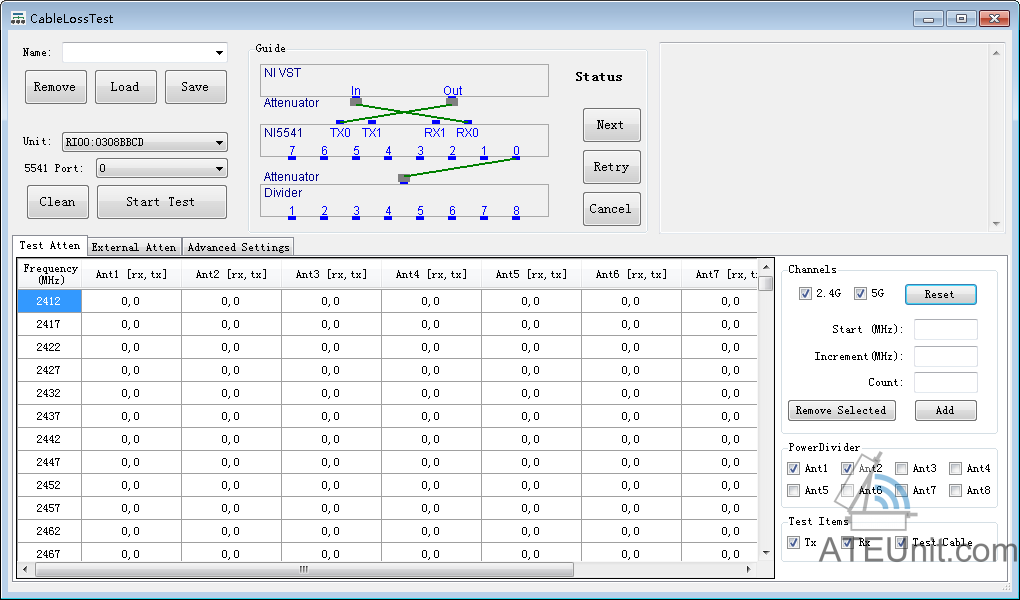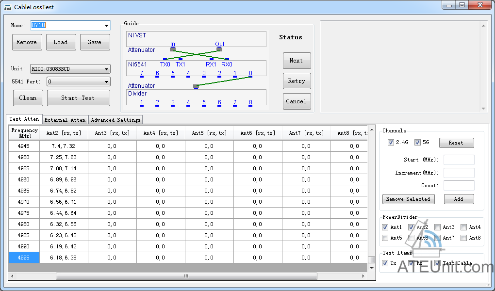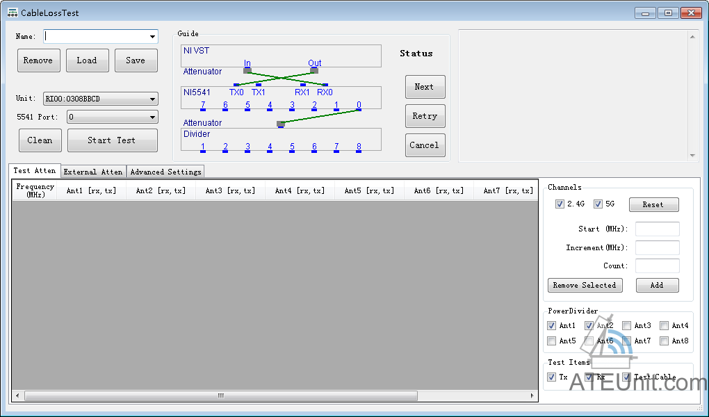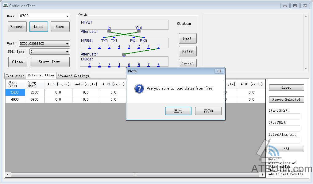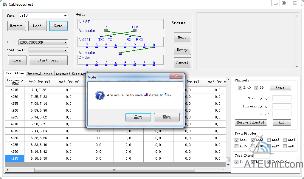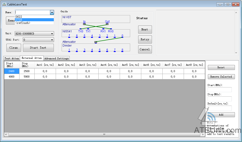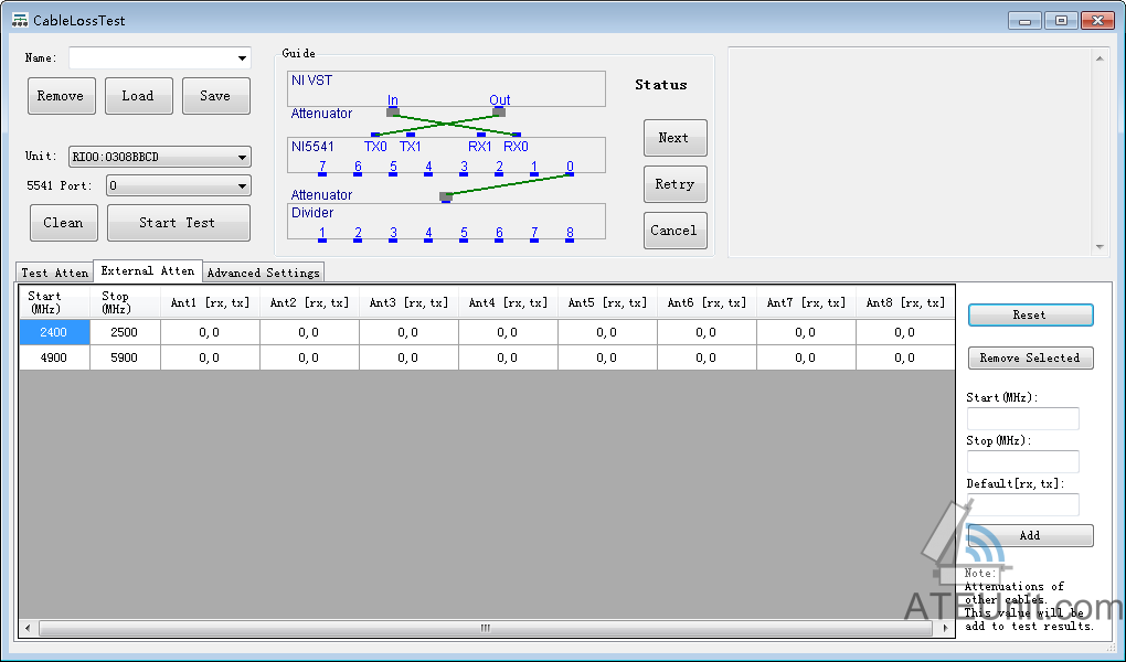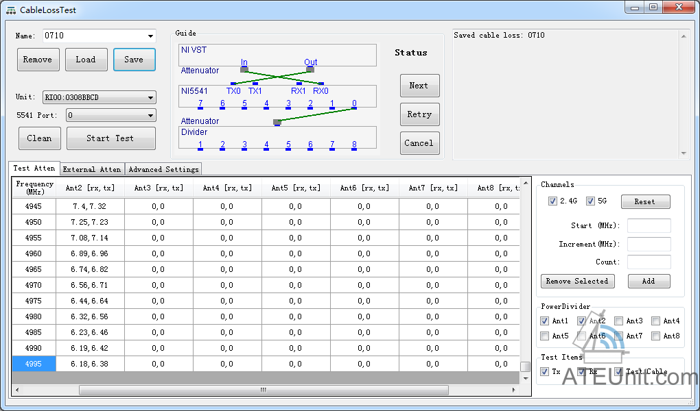 - 先使用ATEUnitRemote中的CableLoss工具来测线损。UDT的IPEX到功分器SMA的衰减,通过CableLoss里的ExternalAtten来设置。